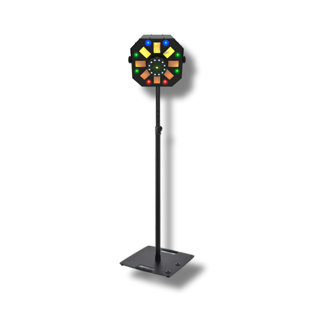 Idéal pour vos petites soirées entre amis. Avec une lumières multi-effet sur pied (laser, disco et stroboscopique).