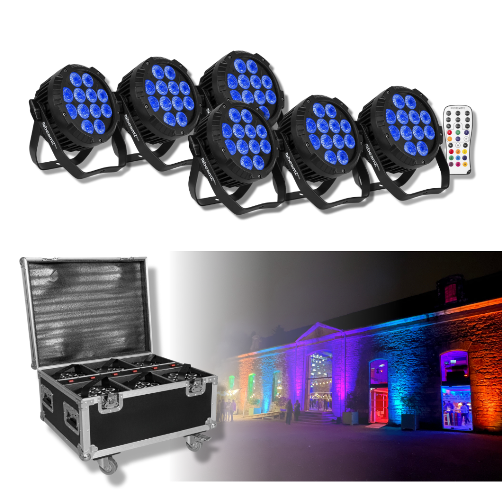Projecteurs sans fil parfaits pour mettre en valeur votre lieu ! Contrôle facile, changement de couleurs, loués par 6 (jusqu’à 24 disponibles).