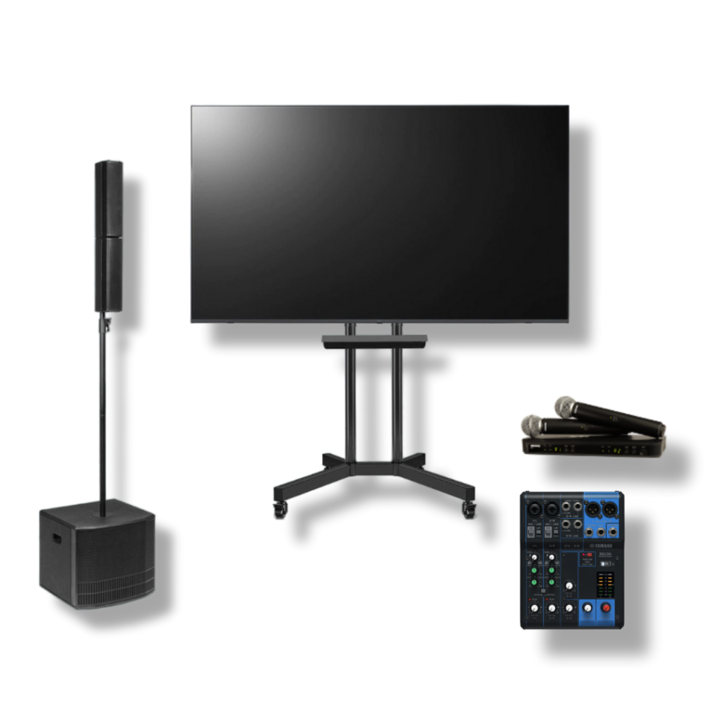 Parfait pour partager un moment ludique ! Avec une télévision LED de 75″ (189cm) sur pied, une mini table de mixage, deux micros sans fil et une enceinte ES503.
