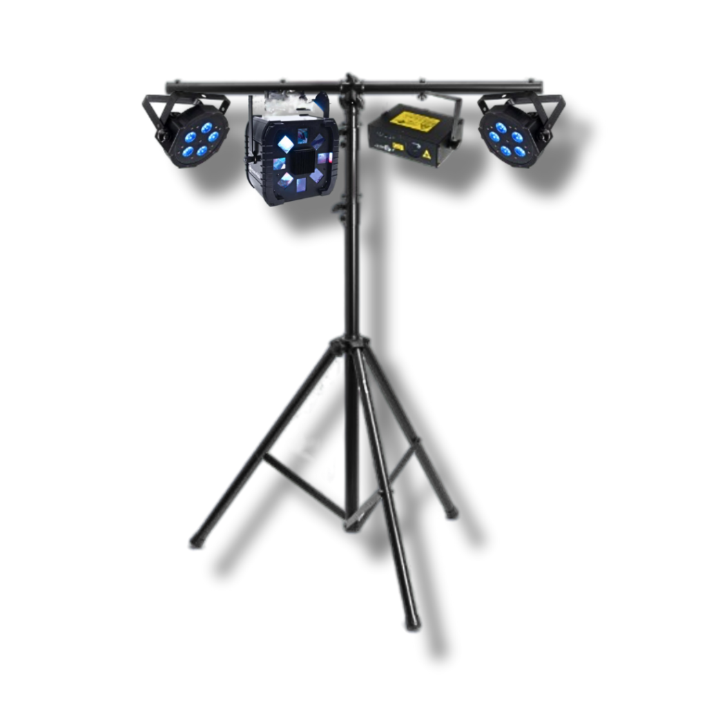 Pack complet pour une soirée lumineuse . Deux projecteurs LEDs changeant de couleur, un laser, un pied, ainsi qu’un jeu de lumière (style disco).